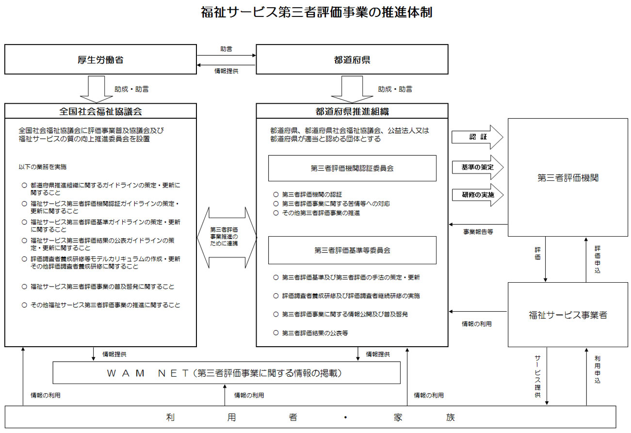 「福祉サービス第三者評価事業に関する指針」(平成16年5月7日)に基づいて国・都道府県において次のような推進体制が整備されることになりました。